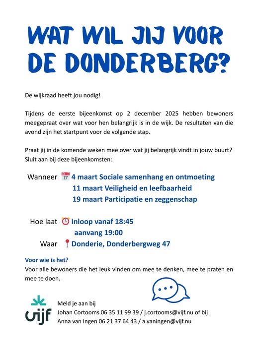 VIJF organiseert in maart 2026 een aantal avonden rondom deze eerste drie thema’s om met bewoners door te praten over de verdere invulling en het vervolg. Hier is de link naar de uitnodiging die is uitgestuurd: https://www.facebook.com/groups/donderberghoogvonderenvijf/